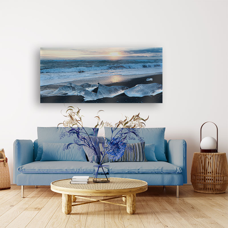 Strand kann aber auch kalt und eisig sein. Aber deshalb nicht weniger schön! Diese Fotografie beweist es. Trotz, oder gerade wegen der Eisschollen im Vordergrund, vermittelt dieses Motiv das Gefühl von der großen Weite und Natur. Was man an einem Badestrand so niemals vorfinden würde.